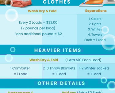 We know how life can get at times. Busy schedules with errands, children, work, and school. You may not have a washer and dryer at home or transportation. Allow us to take a task off your hands!